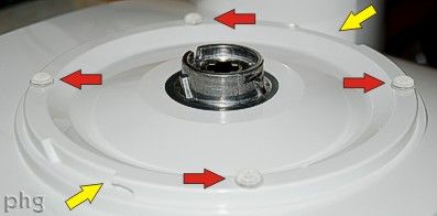 左上方的图像显示“原始风格”不锈钢碗博世通用搅拌机。这个碗可以成功地用在较新的博世“万能Plus”混合器上,但它会在使用过程中摆动很多,除非在万能Plus的底座上添加保险杠,如图所示。保险杠不是博世的产品,它们是自粘相框保险杠,可以在Hobby Lobby或相框商店买到。红色箭头指向保险杠应该粘在的地方。